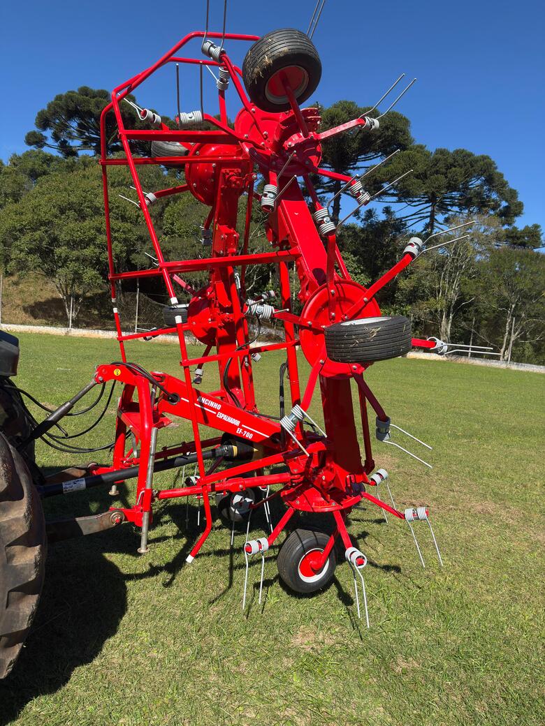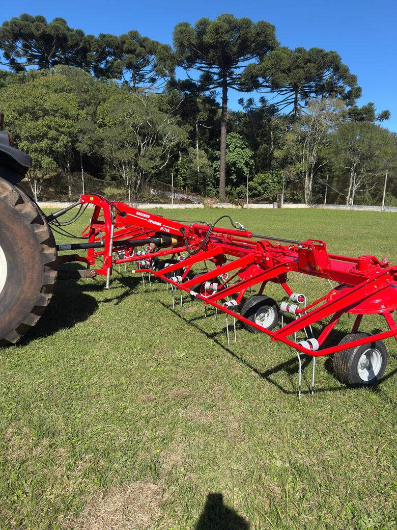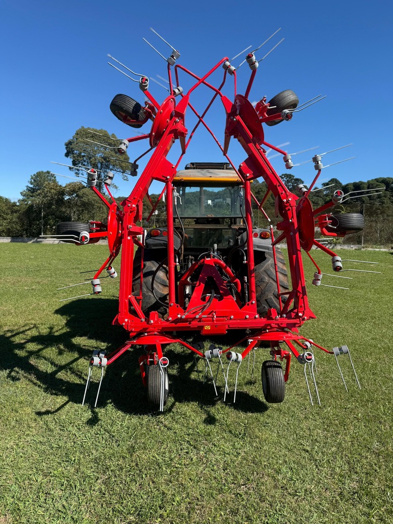 Ancinho com 6 rotores acoplado com molas verticais de alta torção de leve inclinação para melhor recolhimento e espalhamento proporcionando alta produtividade e acompanhamento de terreno e seus rotores.
